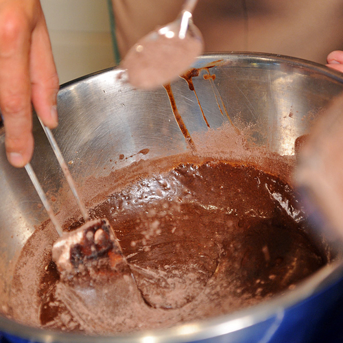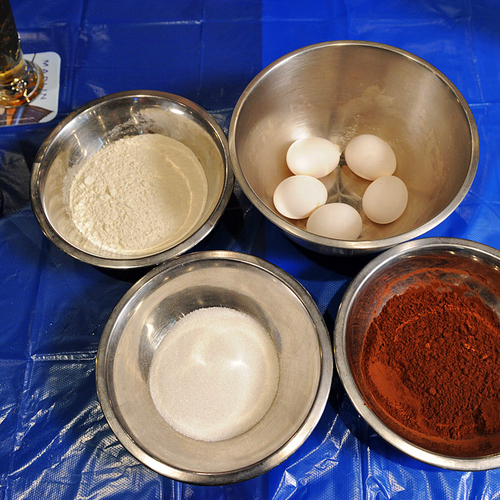 3. Отдельно смешать порошок какао и муку. Медленно ввести в основную массу, постоянно помешивая тесто. Постепенно добавить темное пиво.