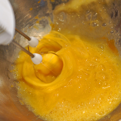 2. Яйца взбить с сахаром до появления пышной пены. Тщательно перемешивая массу, добавить шоколад.