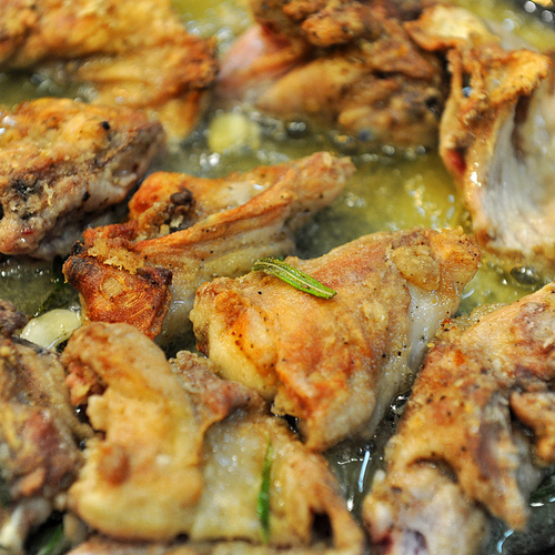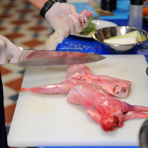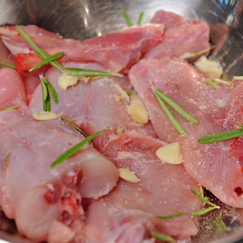1. Тушку кролика разделить на части и замариновать в оливковом масле с чесноком, розмарином, солью, перцем. Оставить пропитываться на 2 часа.
