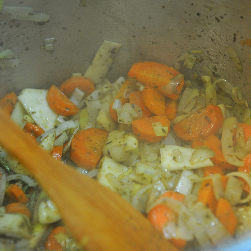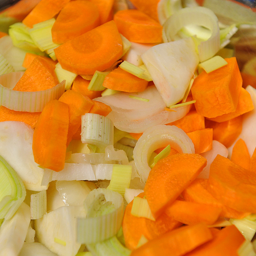 3. Очистить и нарезать полукольцами лук порей, лук репчатый, морковь, корень сельдерея и засыпать в глубокую раскаленную кастрюлю и обжарить до появления золотистой корочки.