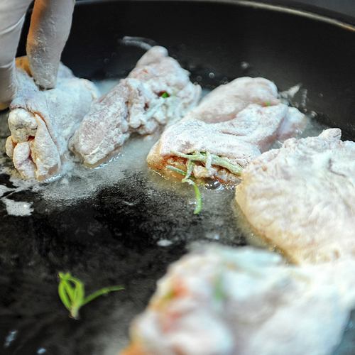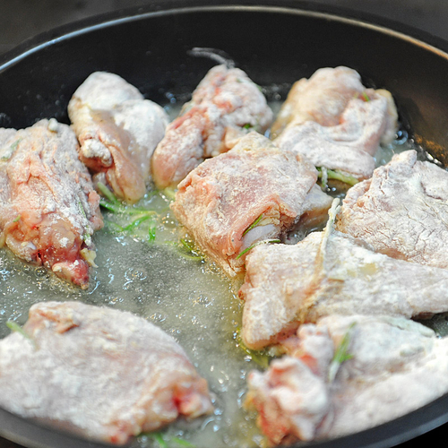 2. Мясо запанировать в муке и пассеровать на разогретом в сковороде оливковом масле до появления золотистой корочки.