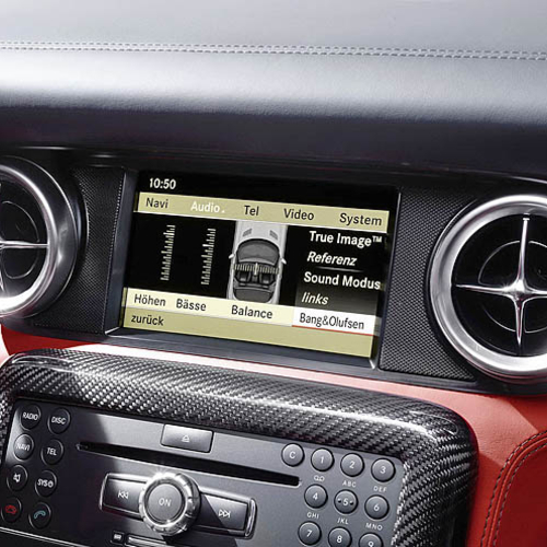 Список внутренних опций Mercedes-Benz SLS AMG также довольно обширный. Рулевое колесо, обшитое кожей и алькантарой обойдется в ?400, спортивные сидения - ?3300, карбоновая передняя панель - ?3500, память для настроей сидения и рулевого колеса - ?1225, аудиосистема Bang & Olufsen BeoSound - ?5900.