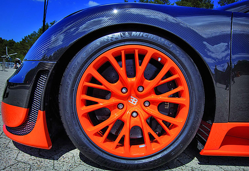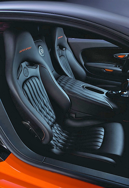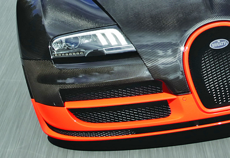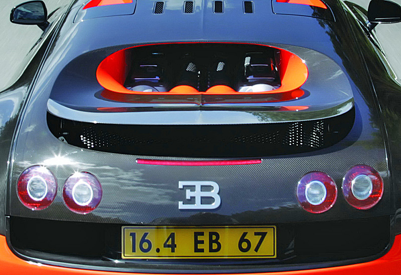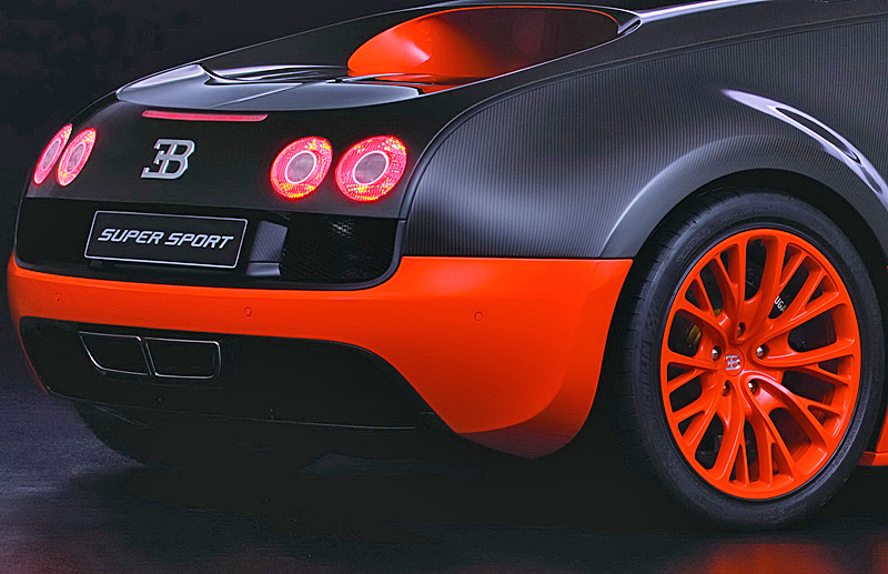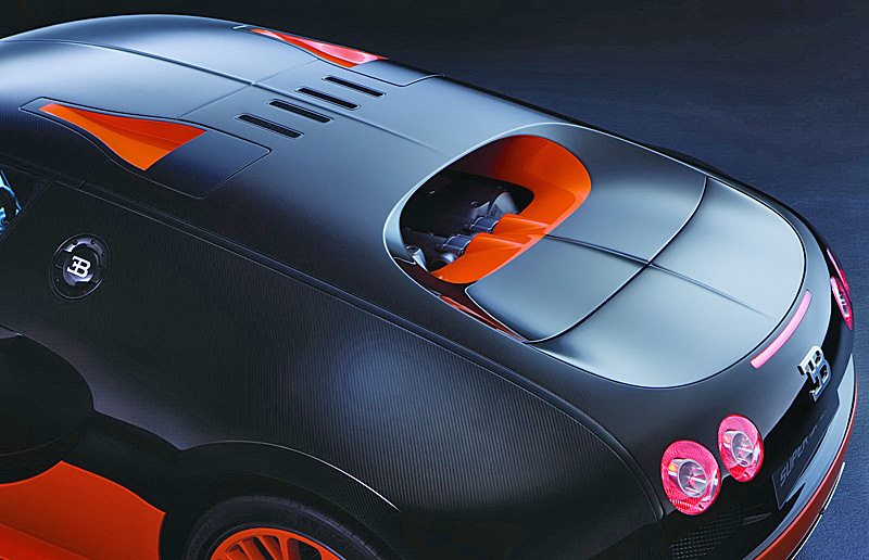 Внешне новинку от стандартного Veyron можно отличить по новому цвету кузова - автомобиль получился традиционно двухцветным, но теперь в палитре присутствует ярко оранжевый цвет. Кроме того, на Bugatti Veyron Super Sport немного изменили моторный отсек автомобиля, который стал более стильным и закрытым.