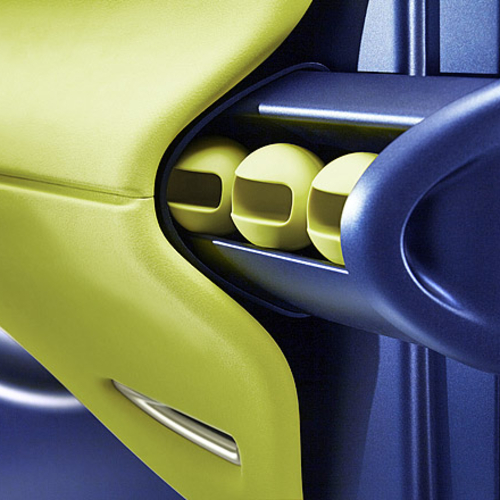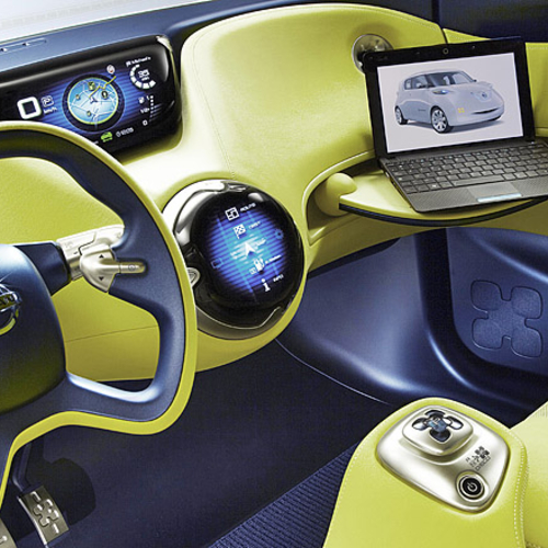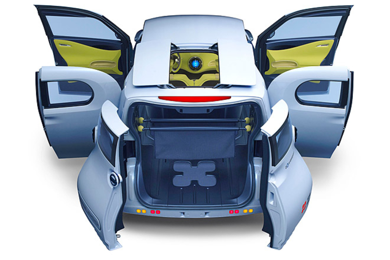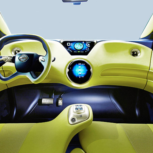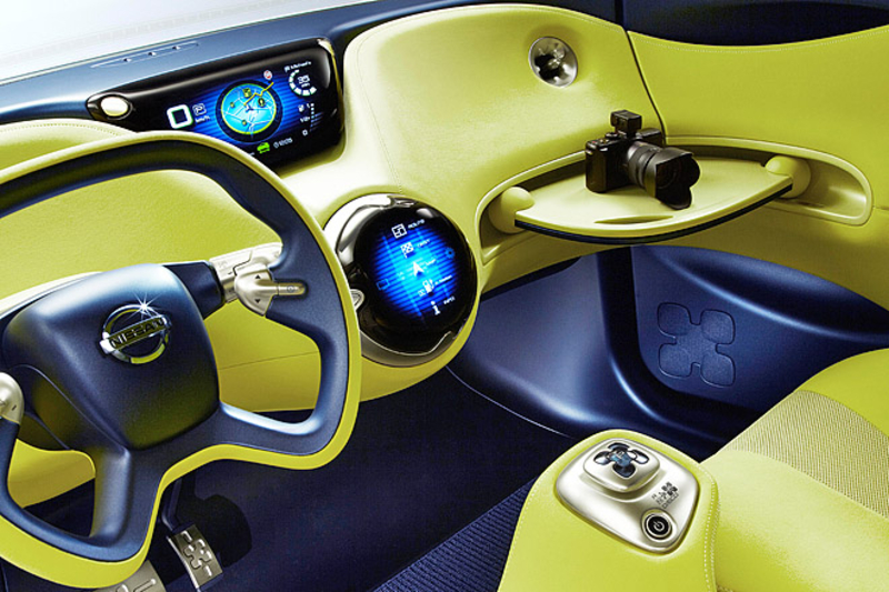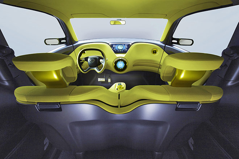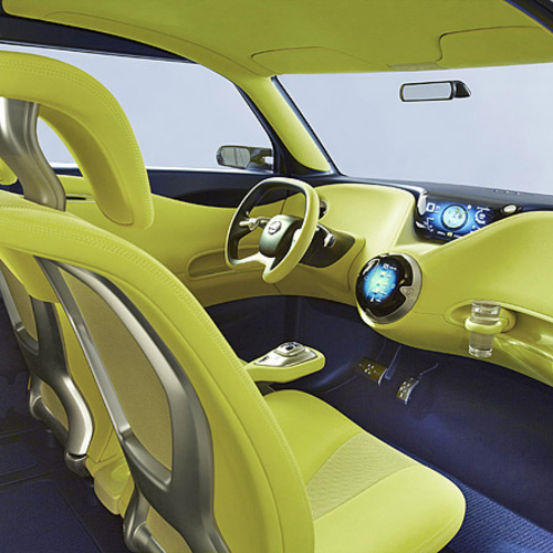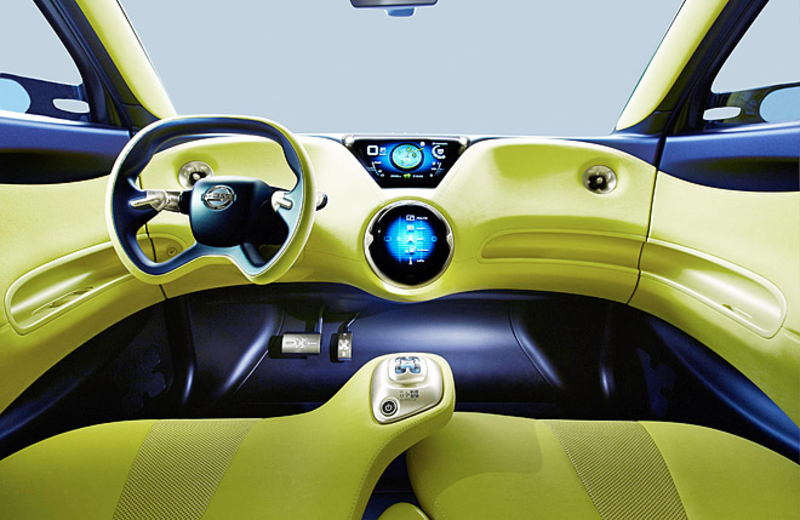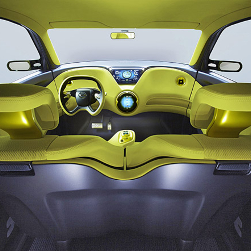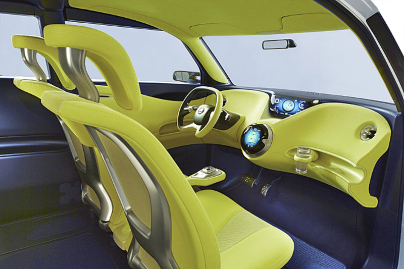 В салоне концепта все предельно просто. Необычная формы "баранка", два цветных дисплея и небольшой контроллер между передними сидениями - вот и весь арсенал приборов, отвечающих за руководство автомобилем. На верхний монитор выводится скорость авто, запас энергии в батареях, оставшийся запас хода и данные навигации.