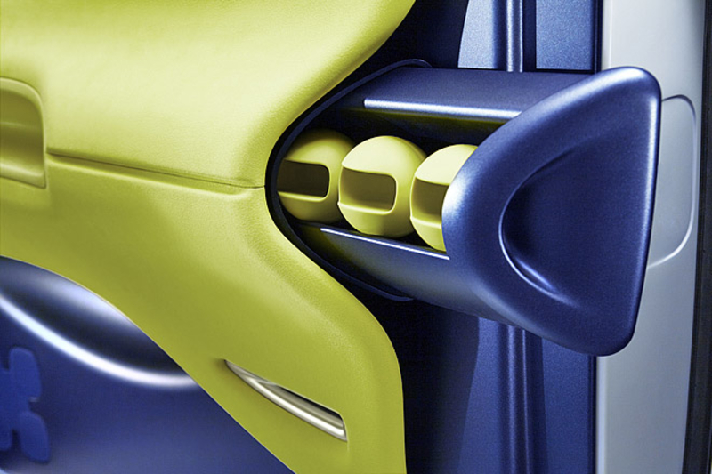 Интересной деталью интерьера также является небольшая полочка на пассажирском месте, которая закрепляется с помощью небольших мячиков с прорезями. На ней можно удобно разместить ноутбук либо фотоаппарат.