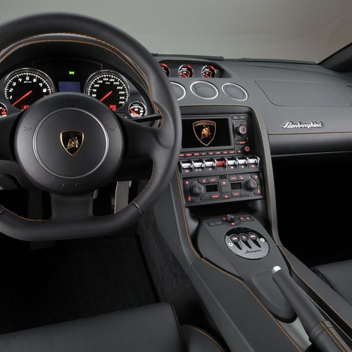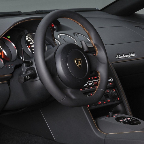 В салоне Gallardo LP 560-4 Bicolore обилие черного цвета. Некоторый контраст в новой версии Lamborghini создает оранжевая строчка.