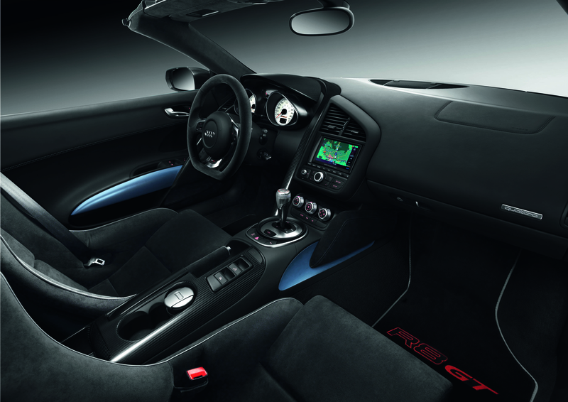 Благодаря использованию новейших технологий при создании кузова, масса Audi R8 GT Spyder составляет 1640 кг, что на 85 кг меньше, чем стандартный спайдер с 5,2-литровым мотором FSI. Внешне новый суперкар можно узнать по серым элементам аэродинамического обвеса.