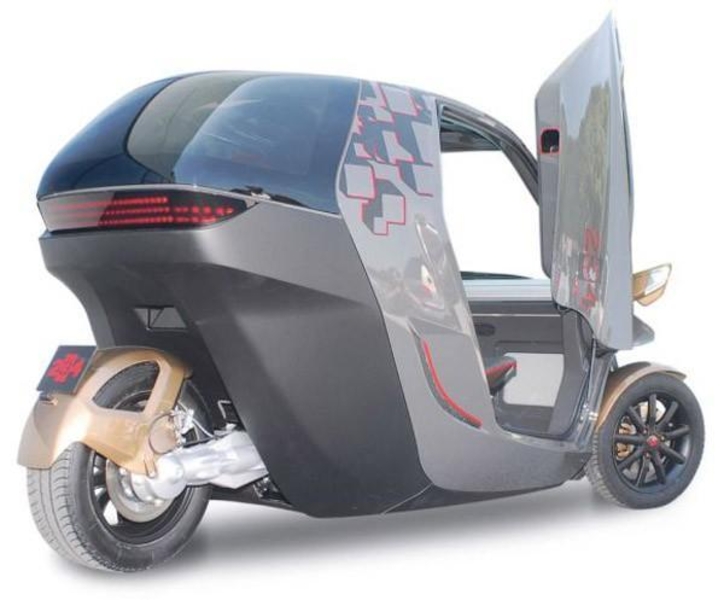 Кузов трехколесного автомобиля с поднимающимися вверх дверями в стиле Lamborghini изготовлен из пластика, благодаря чему масса новинки составляет всего 500 килограммов.