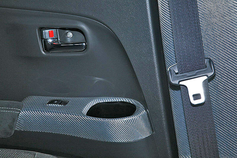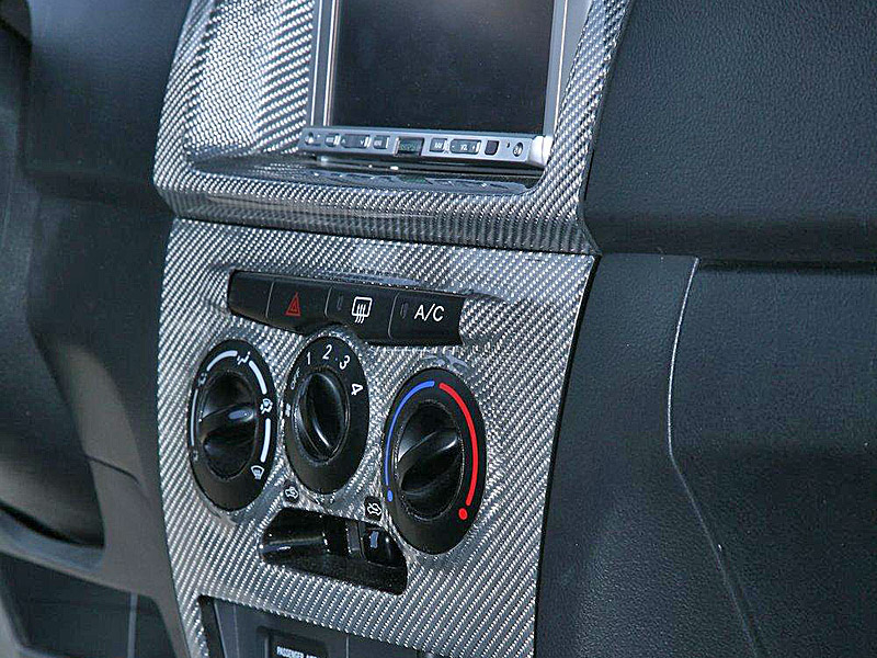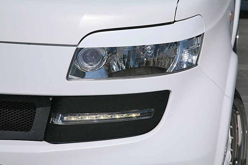 В пакет внешних доработок автомобиля вошли сразу 4 варианта обвеса Daihatsu Materia Icecube, которые можно установить сверху на стандартные элементы кузова, дополнительные накладки на фары и задний диффузор. Кроме того, тюнеры предлагают установить на автомобиль трапециевидные зеркала заднего вида и карбоновые дверные ручки.