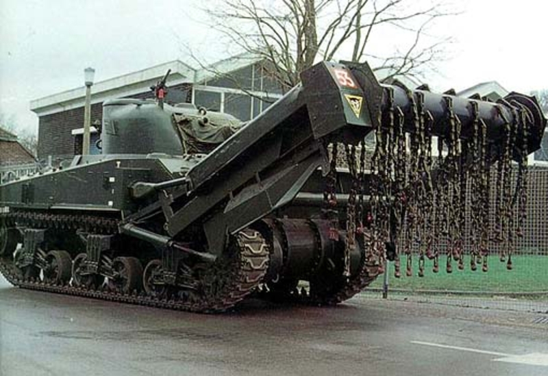 Пока войска союзников пытались разминировать поля с помощью катков и плугов, американский политик, военный и писатель Уильям Шерман разрабатывал новый минный трал с барабаном и цепями. Изобретение в войне особой пользы не принесло. Но выглядело впечатляюще.