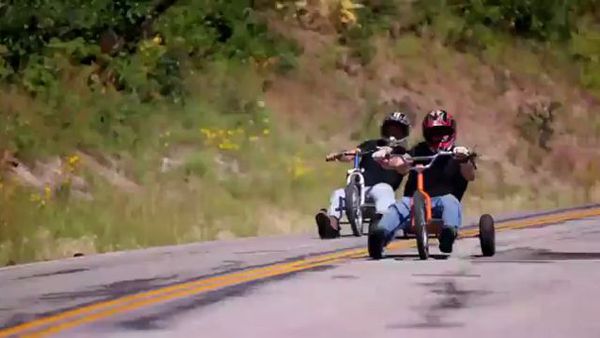 Троим смельчакам удалось разогнать трехколесные велосипеды до 90 км/час, и ехали они с горы без тормозов.
