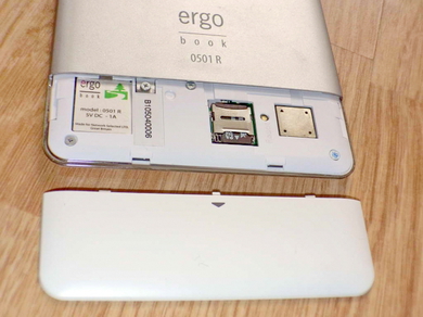 Корпус Ergo Book 0501R сделан из крепкого и легкого пластика. Тыльная часть корпуса - алюминиевая. Такое решение существенно повышает надежность устройства и придает ему схожесть с "яблочными гаджетами". Под задней нижней крышкой имеется доступ к слоту карты памяти и аккумуляторному отсеку.