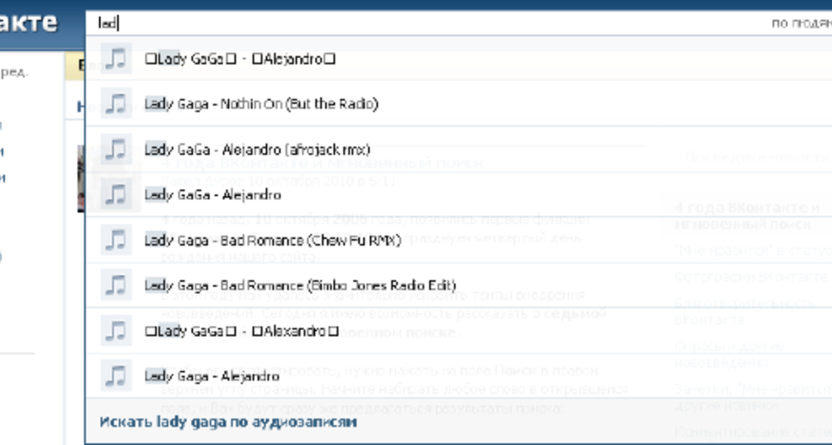 Кроме того, администрация сервиса запустила функцию мгновенного поиска по аудио- и видеофайлам. Результаты поиска в этом случае отображаются непосредственно по мере ввода поискового запроса.