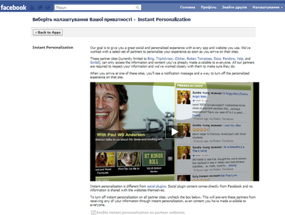 8. Отключив пункт "мгновенная персонализация", можно запретить автоматическую авторизацию пользователя на всех сайтах, на которых есть виджеты Facebook.