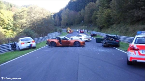 На участке трассы, где проводились ремонтные работы, столкнулись сразу восемь автомобилей, среди которых и немецкий спорткар BMW M5 Ring Taxi. Как стало известно, один из гонщиков не успел вовремя затормозить и врезался во впередиидущую машину, в результате чего его отбросило в сторону, где он зацепил еще несколько автомобилей.