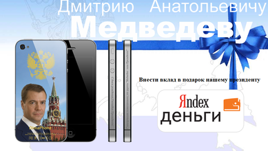 Группа интернет-поклонников Дмитрия Медведева решила подарить своему кумиру эксклюзивную модель iPhone 4 с его изображением на тыльной части смартфона.