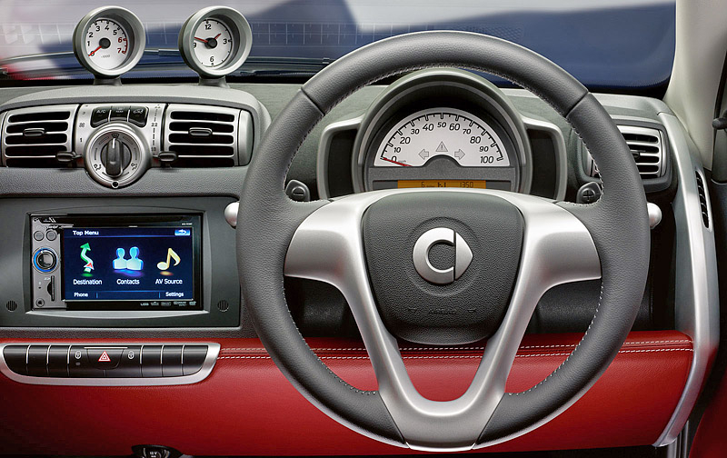 В отделке интерьера преобладают красно-черные цвета и кожа. Красной кожей обтянуты сиденья Rosso, дверные панели и рычаг ручного тормоза. Верхняя часть приборной панели обтянута в контрастно-черную алькантару. Smart также добавил, логотип «gb-10» на подголовниках.