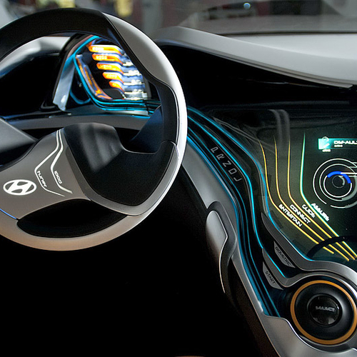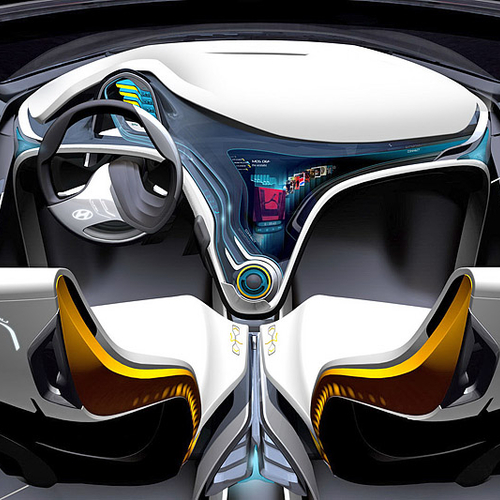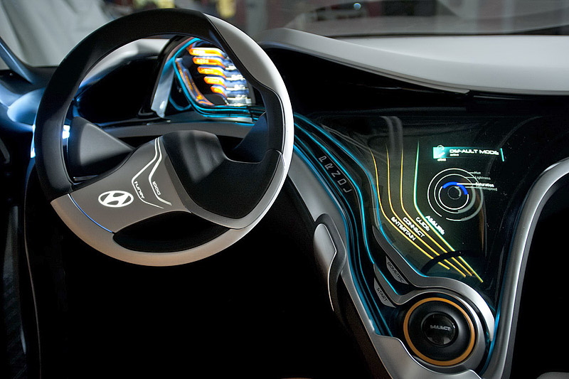 Салон Hyundai Curb получился максимально футуристичным. Причем, не только внешне, но и функционально - здесь есть система BlueLink, с помощью которой можно смотреть фильмы и выходить в Интернет. Кроме того, водитель может следить за состоянием Curb на расстояние, с помощью мобильного телефона.