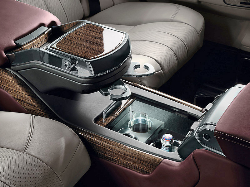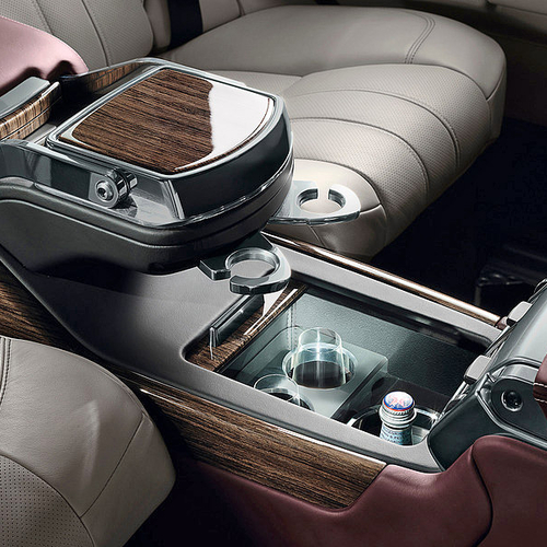 Кожа, дерево и алюминий широко используются в оформлении салона. В тоннель, который разделяет авто на две половины, спрятаны холодильник и ноутбук. В подголовники передних кресел встроены iPad. Колеса посажены на уникальные 20-дюймовые диски.