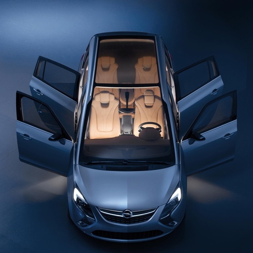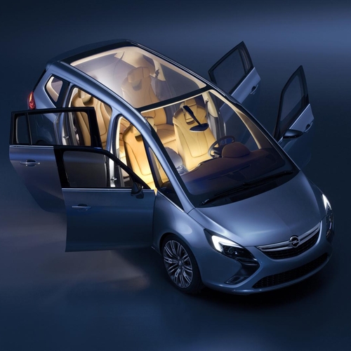 Прототип Opel Zafira получил огромную панорамную крышу, полный набор мультимедиа с большими цветными мониторами для пассажиров заднего ряда, светодиодные фары дневного света, би-ксеноновую головную оптику и 20-дюймовые колесные диски.