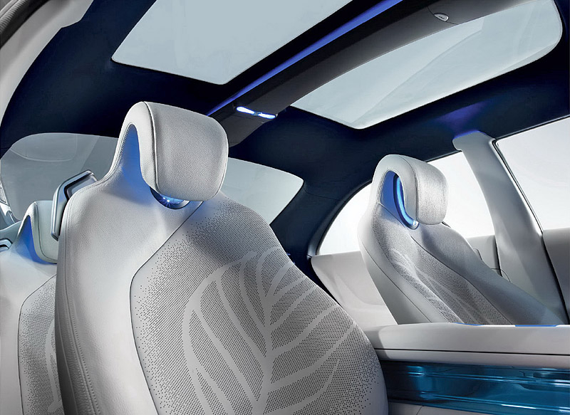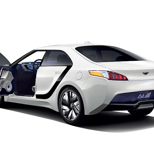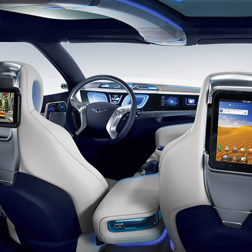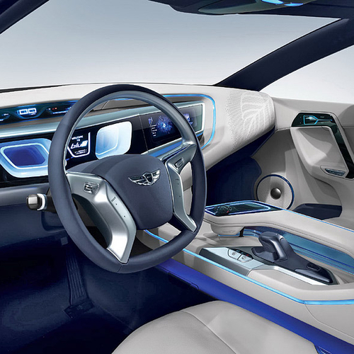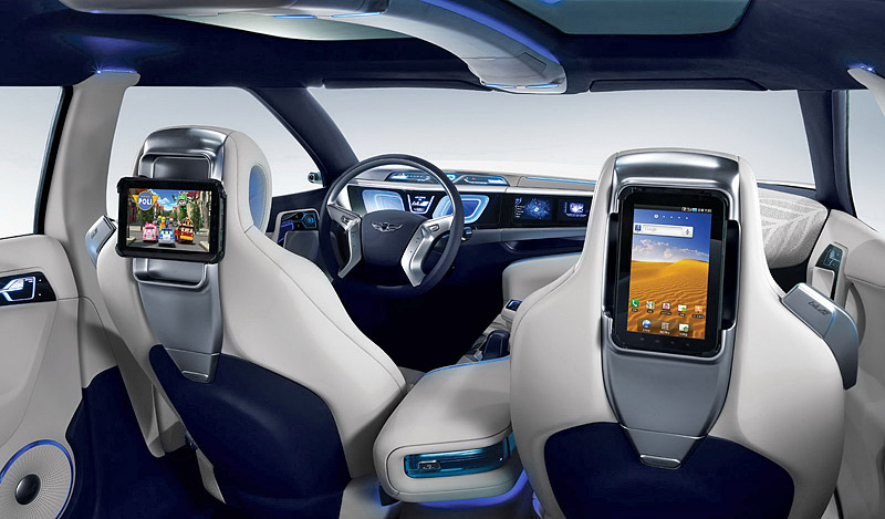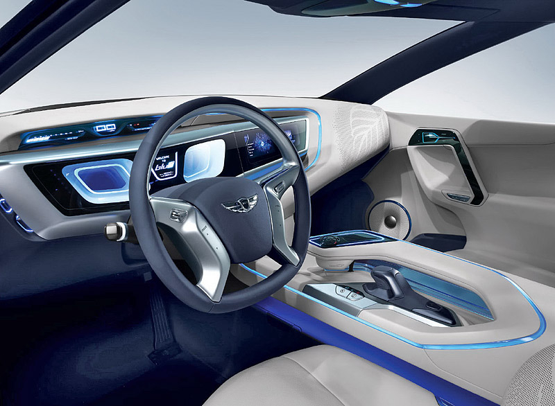 Салон Hyundai Blue2 выглядит не менее футуристично - приборную панель объединили с центральной консолью в один общий блок, а место на центральном тоннеле занял огромный подлокотник с уникальной мультимедийной системой, управляемой с помощью Motion Sensor Moustick.