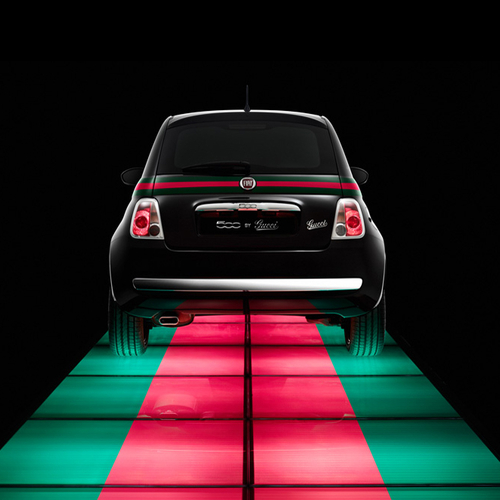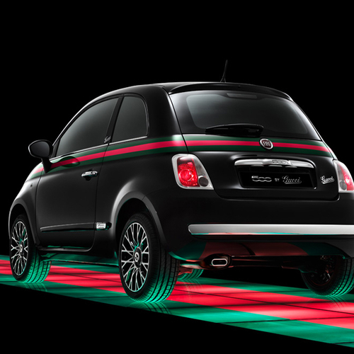 Соблазнительная модель в черном комбинезоне позирует на фоне дизайнерского Fiat 500, подчеркивая его обновления, над которыми потрудились дизайнеры Gucci. В разработке дизайна автомобиля принимала участие даже креативный директор Gucci Фрида Джаннини.