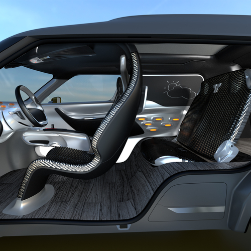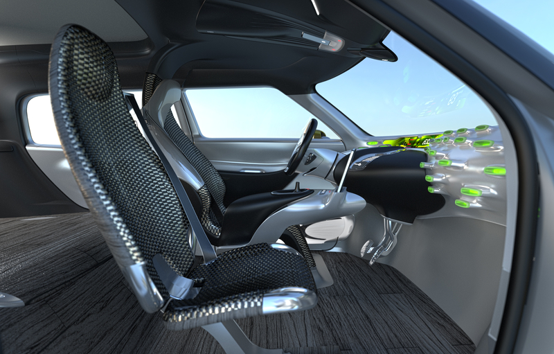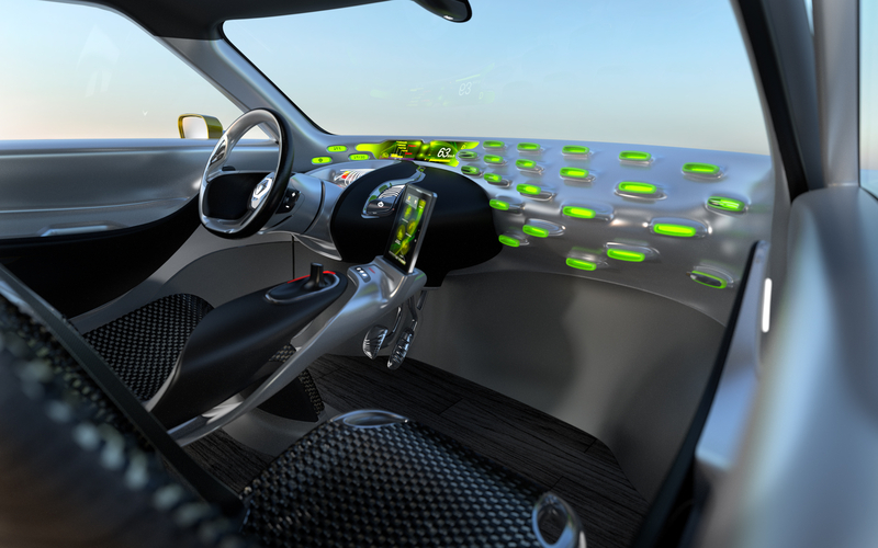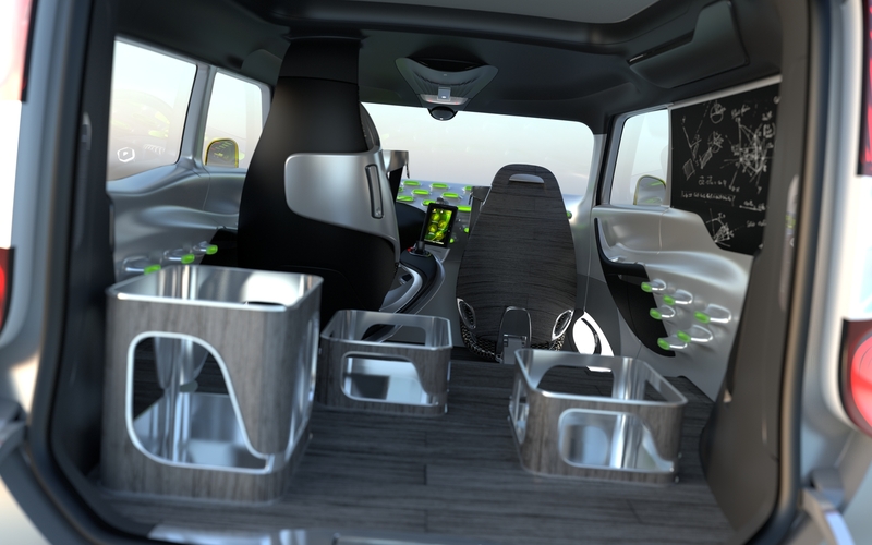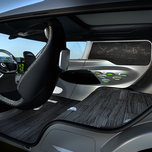 Передняя панель машины и вовсе представляет собой поле из "светлячков" зеленого цвета. По центру переднего ряда расположится iPad. Ну куда же без него?