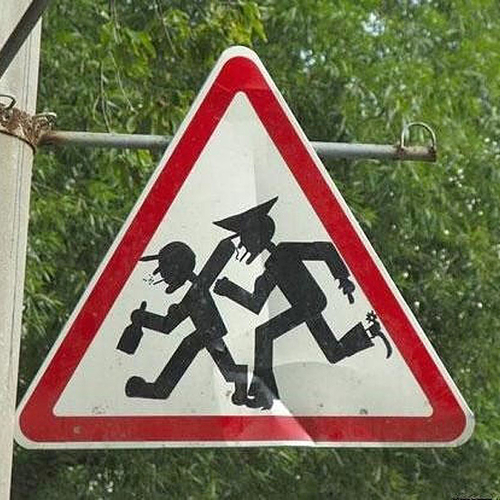 Этот знак, наверняка, является работой каких-то умельцев, и изначально был "Осторожно, дети! ", но теперь полицейский в фуражке и со шпорами гонится за хулиганом с бутылкой и сигаретой.