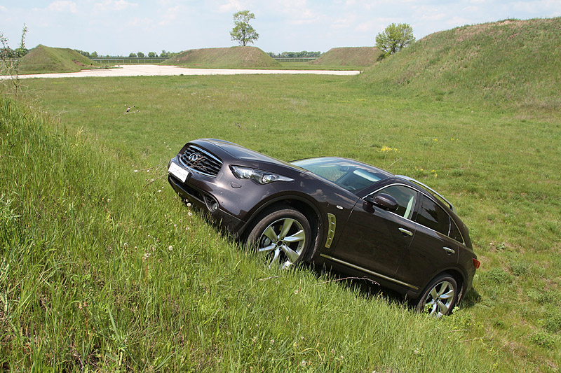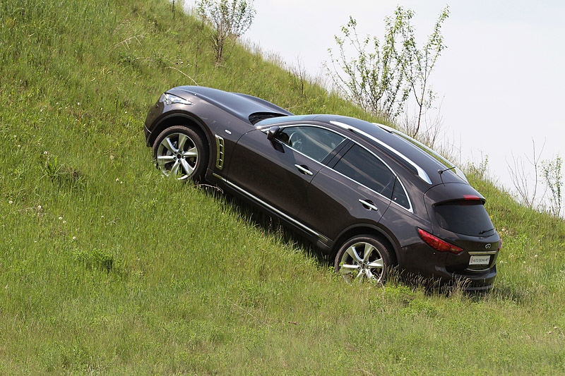 Усложняла задачу густая трава. Но, вопреки нашим опасениям, эти условия не вызвали никаких проблем у Infiniti FX. Благодаря электронному интеллекту и регулируемому электроникой распределению крутящего момента между осями, кроссовер играючи трогается по скользкому подъему, поскрипывая активно работающими тормозами и слегка пробуксовывая то одним, то другим колесом.