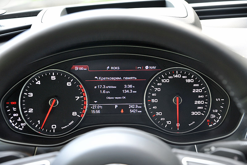 При всем этом, если вы не успели переключиться из комфортного режима в динамичный, стоит лишь немного сильнее "топнуть" по педали акселератора. А6 мгновенно отзовется утробным рыком шести цилиндров и "выстрелит" с места, загоняя стрелку тахометра в красную зону перед каждым переключением.