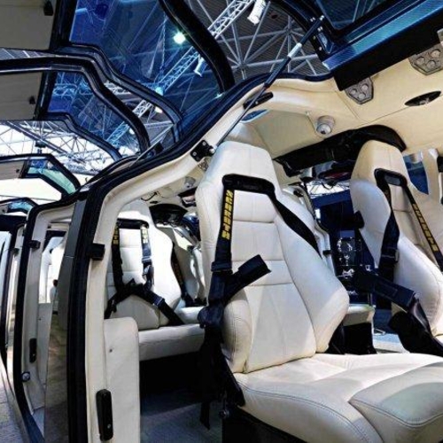 Доступ в салон Superbus осуществляется через двери типа "крыло чайки", которых в автобусе 16 штук. За дверями находятся белые спортивные сидения, в объятиях которых пассажиров будут удерживать четырехточечные ремни безопасности. Всего люксовый автобус вмещает 24 человека, включая водителя.