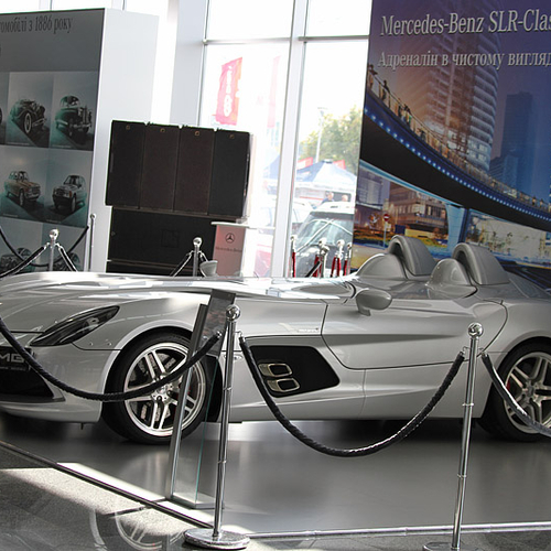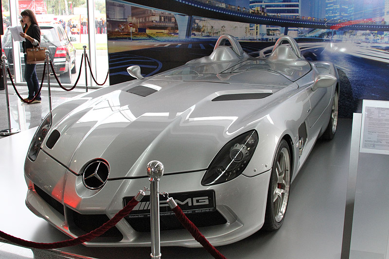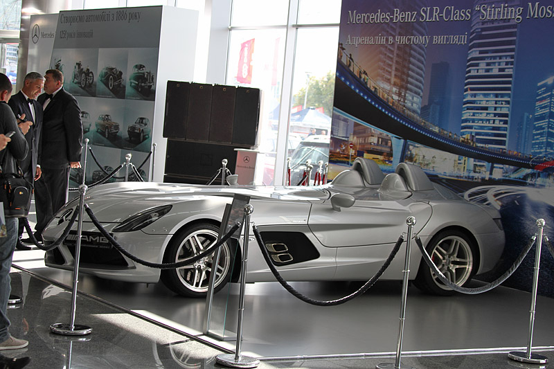 Компания Mercedes-Benz специально к автошоу привезла в украинскую столицу первый автомобиль в мире, а также экстремальный родстер Mercedes-Benz SLR Stirling Moss.