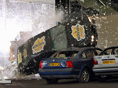 В Лондоне 64-летний голливудский каскадер Рок Тэйлор за рулем автомобиля разнес огромное стекло, а затем приземлился на припаркованные машины. И все для того, чтобы попасть в Книгу рекордов Гинесса.