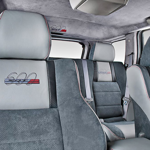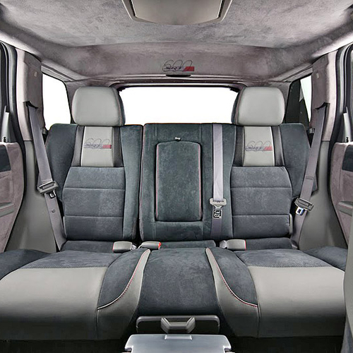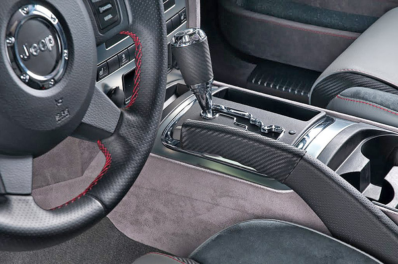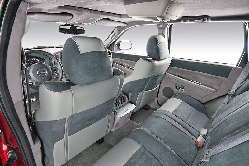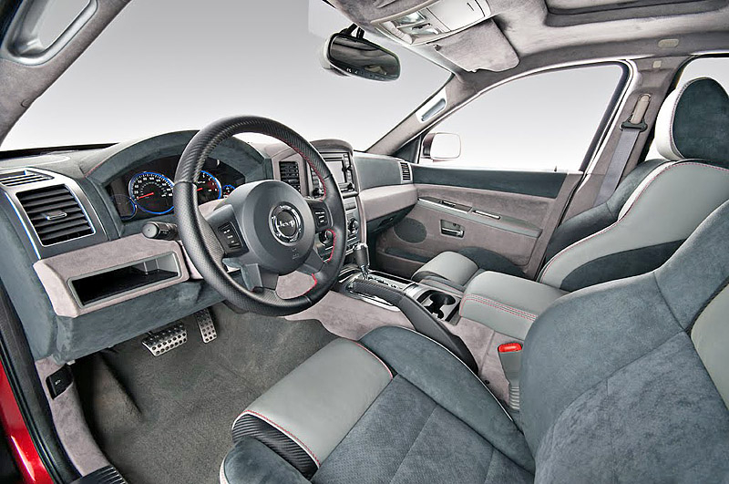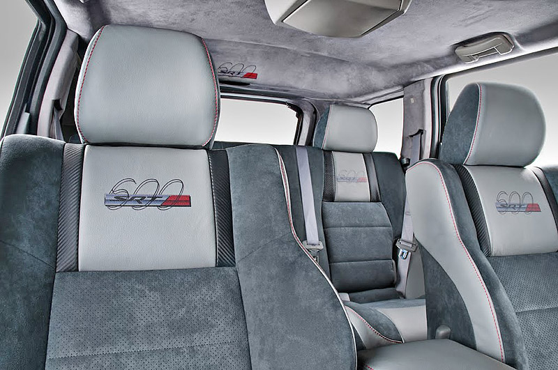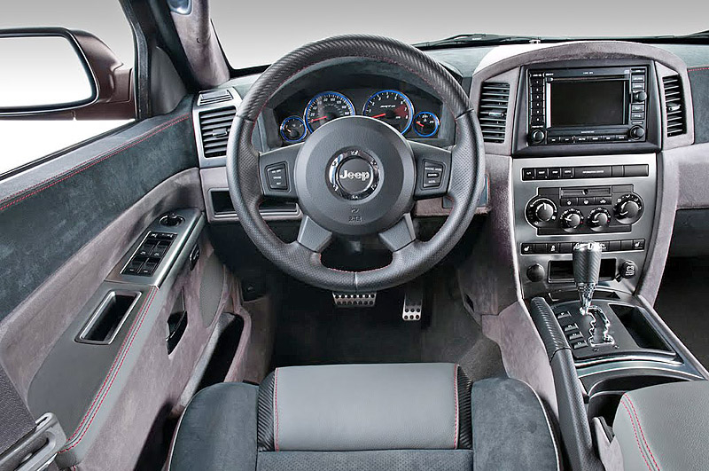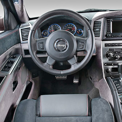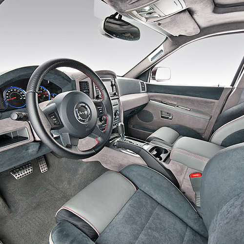 Внутри Jeep Grand Cherokee SRT600 отделан дорогой серой кожей и алькантарой. Причем, дорогими материалами отделаны не только сидения, но и приборная панель и даже потолок.