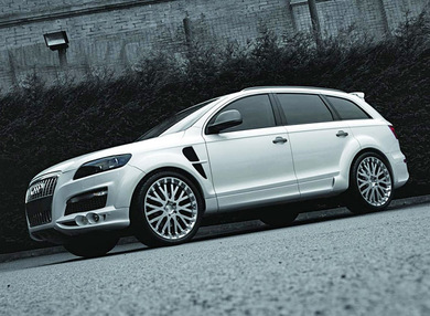 От стандартного Q7 новинка отличается оригинальным белым цветом Pearl Soft White, дополнительным аэродинамическим обвесом, расширителями колесных марок и просто огромными 22-дюймовыми колесными дисками Kahn RS-X.