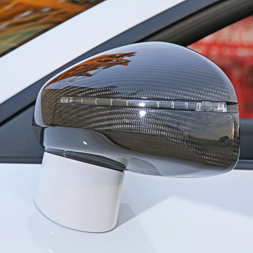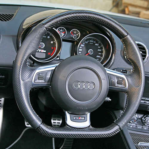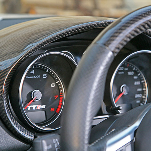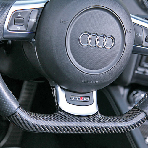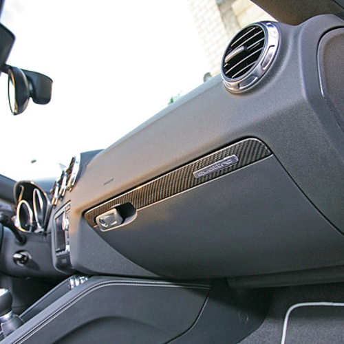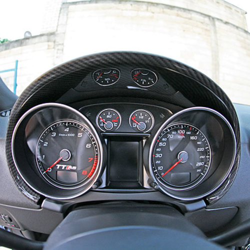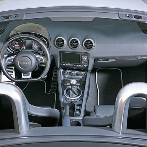Audi TT RS стал внешне более агрессивным, если такой эпитет вообще применим к автомобиля с открытым верхом. Все благодаря карбоновым элементам кузова, в том числе небольшому спойлеру на крышке багажника, зеркалам заднего вида и дополнительному аэродинамическому обвесу.