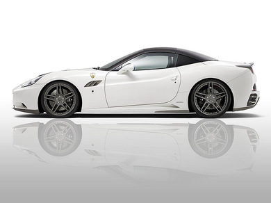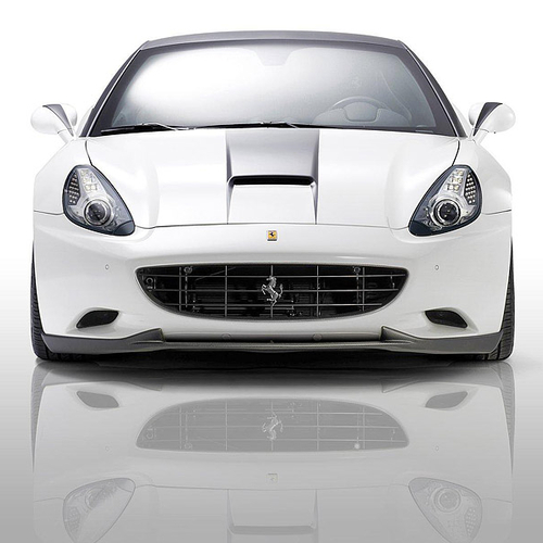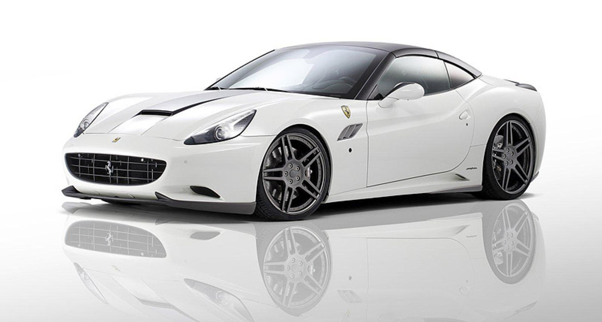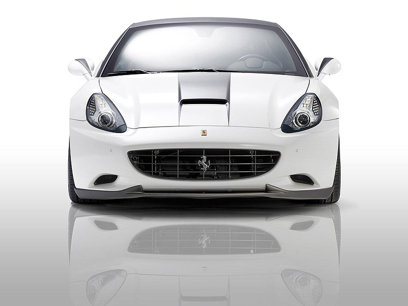 Итальянская California снежно белого цвета с черной крышей получит новый передний бампер с мощной "юбкой", агрессивный задний диффузор, дополнительные воздуховоды в капоте и передних крыльях, а также несколько карбоновых элементов.