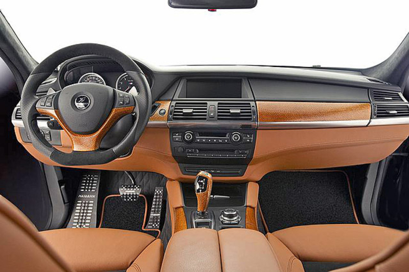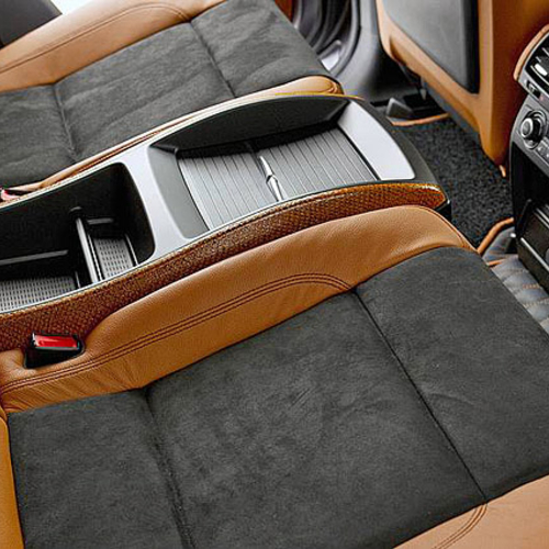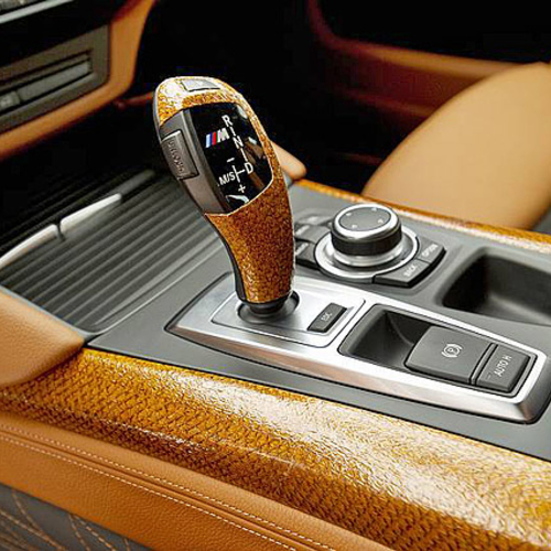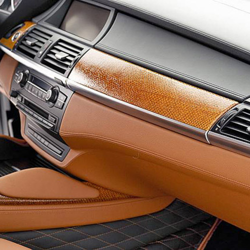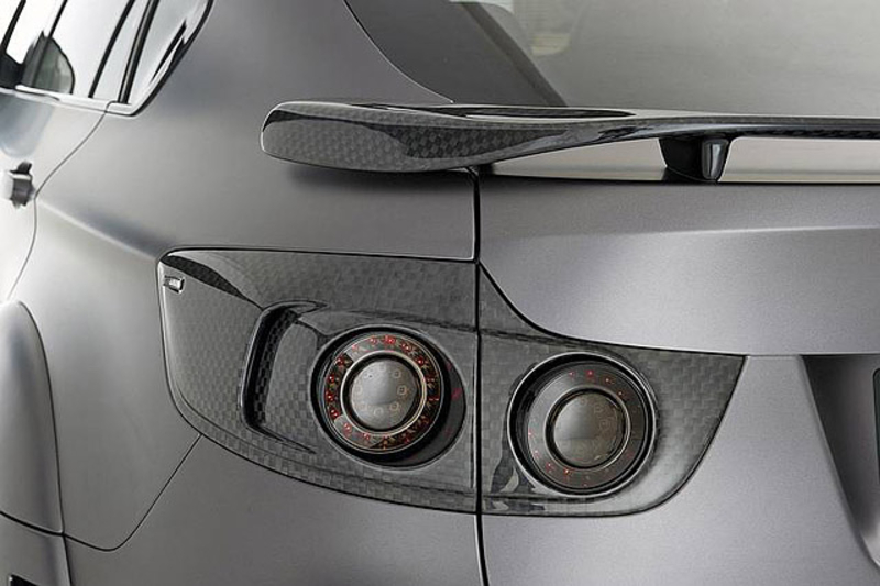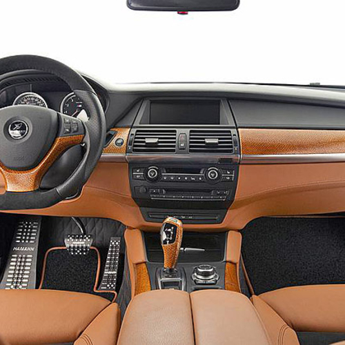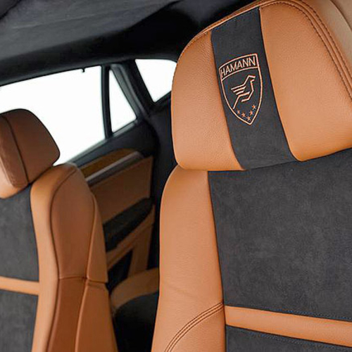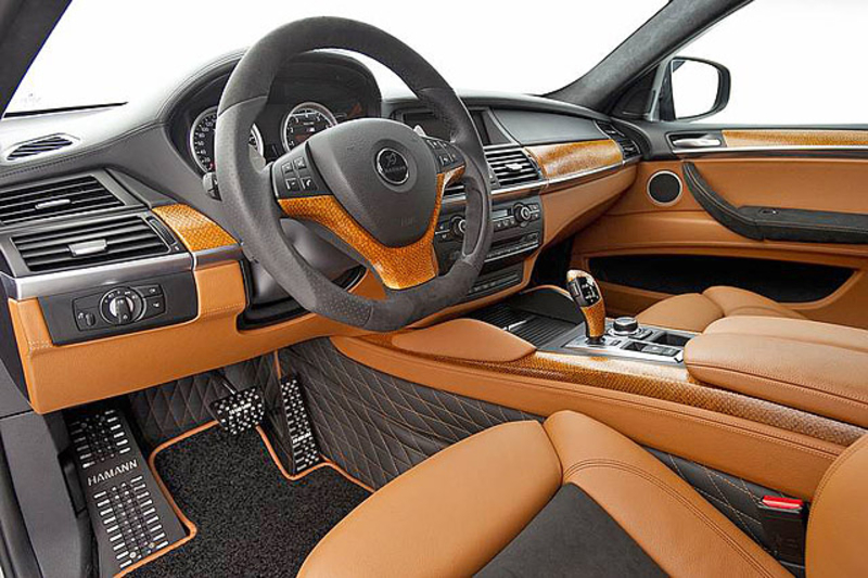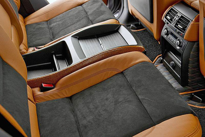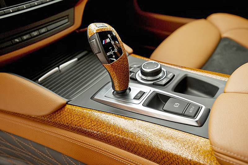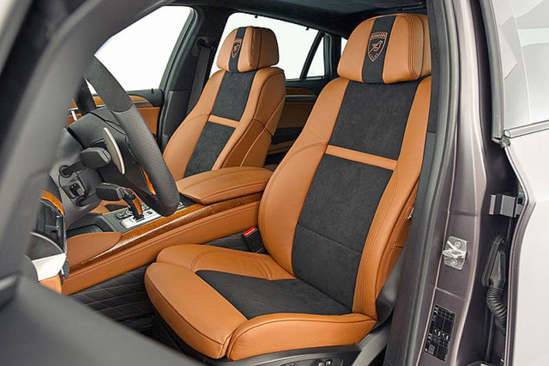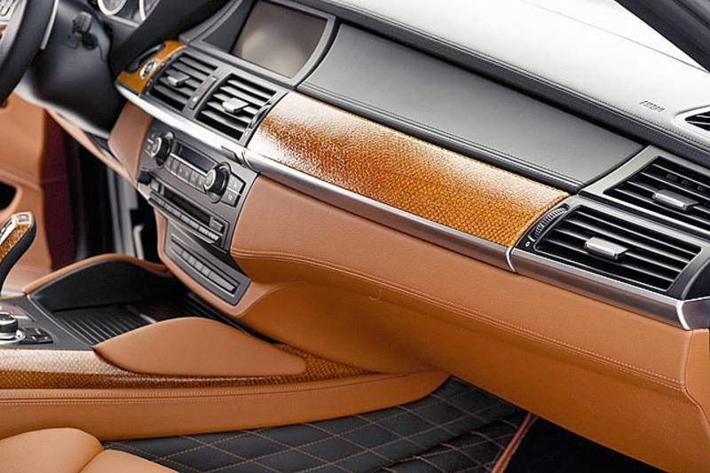 Интересная новая деталь тюнингового BMW X6M - салон, отделанный эксклюзивным видом кожи, снятым с одного из видов северного лосося. После специальной обработки, она приобретает фактуру змеиной кожи и становится очень прочной.
