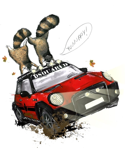 Сам заявленный автомобиль окрашен в красный цвет, а на дверях видны черные полоски и изображение кленового листа. Он является логотипом креативного бюро DSQUARED2, которым руководят братья Кейтенами.