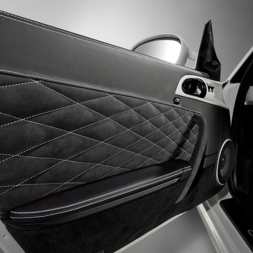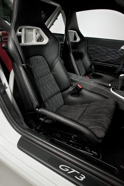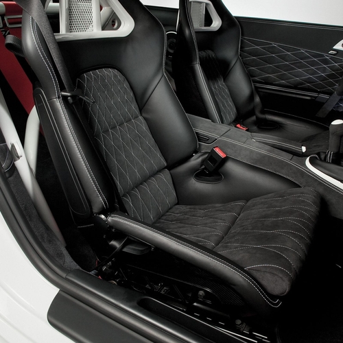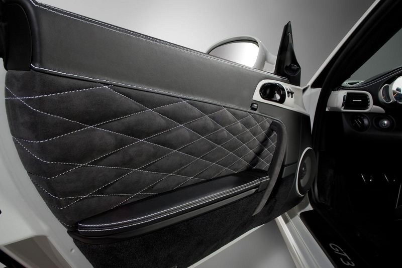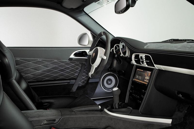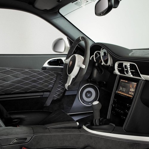 Немецкий суперкар Porsche 911 GT3 получил по истине люксовый салон. Интерьер автомобиля отделан дорогой кожей, алькантарой, а приборная панель и центральная консоль получили белые полированные вставки. Кроме того, в гоночный спорткар тюнеры умудрились впихнуть аудио-систему мощностью 2100 Вт.