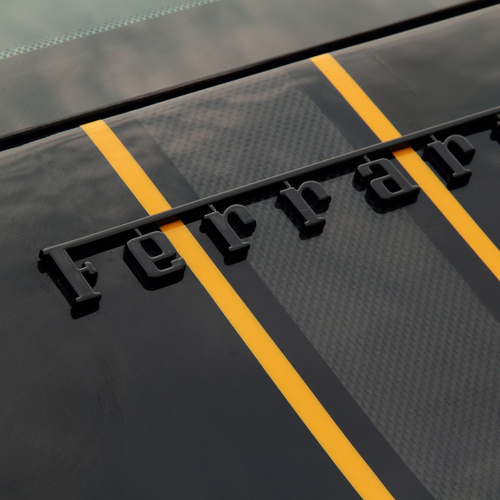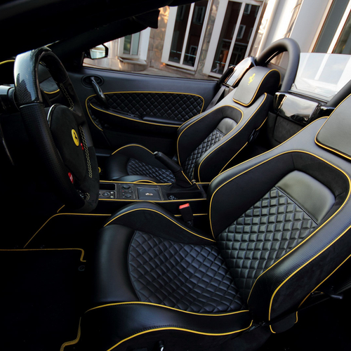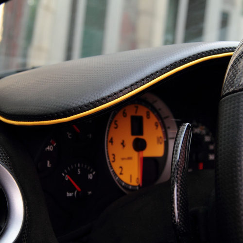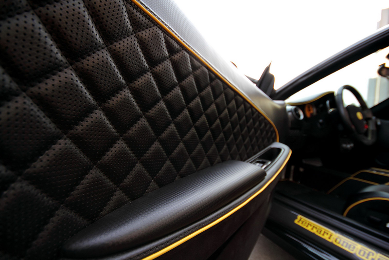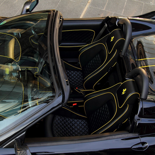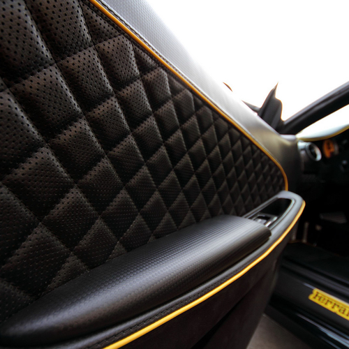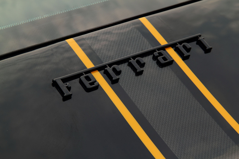 В салоне Ferrari засилие черной кожи и алькантары, на которой контрастируют желтые строчки. Кроме того, руль, рычаг ручного тормоза, дверные карты и рычаг переключения передач получили вставки из карбона.