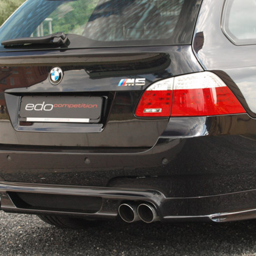 В пакет внешних доработок универсала BMW M5 вошли новый передний бампер с дополнительными фонарями, новый задний бампер, спойлер на крышке багажника и эксклюзивные патрубки выхлопной системы. Машину обуют в черные 20-дюймовые колесные диски с серебристой окантовкой.