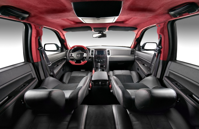 Салон Grand Cherokee SRT600 обшит элегантной красной и черной алькантарой, а также черной кожей. Также присутствует декоративная отделка красными швами. Стоит отметить, что эта работа сделано по специальному заказу.
