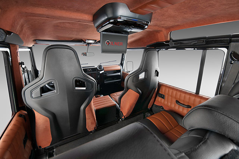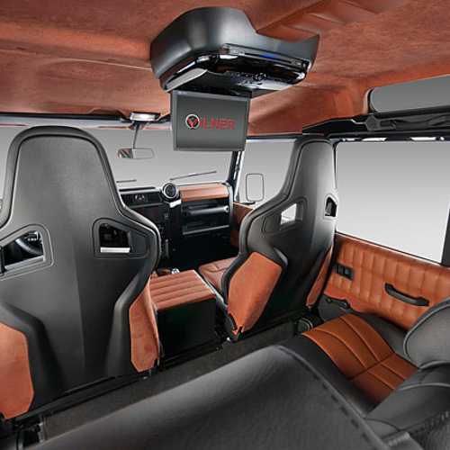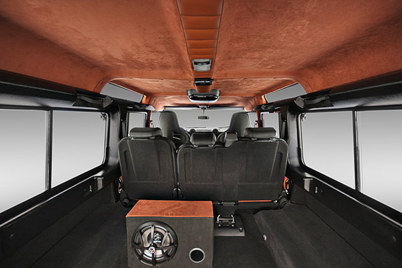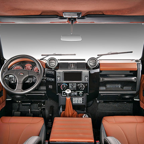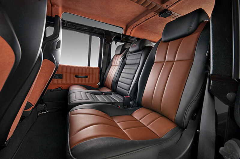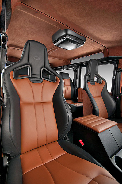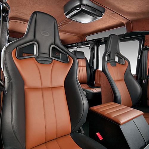 Несмотря на весь тюнинг, Land Rover Defender остался по-спартански скромным. Передние сидения сильно разнесены по сторонам, так что водителю и переднему пассажиру придется прижиматься к дверям и окнам. Задние сидения также остались, в принципе, вездеходными.