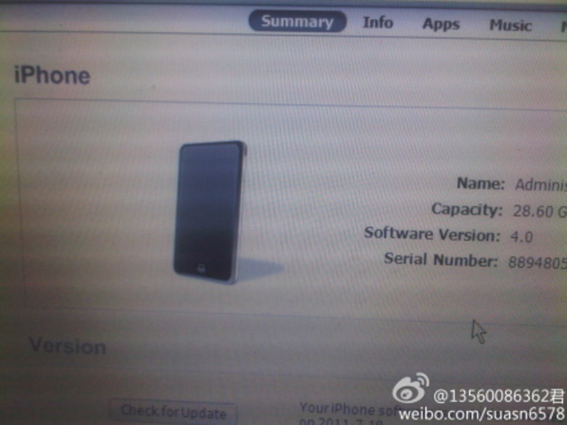 При подключении к компьютеру iTunes определяет новый смартфон как версию iPhone 4 с 32 ГБ памяти и установленной прошивкой версии 4.0.