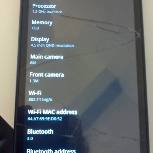 Из аппаратных особенностей следует отметить двухъядерный процессор Qualcomm MSM8660 с частотой 1,2 ГГц, оперативной памятью объёмом 1 Гб и наличие 8-мегапиксельной фотокамеры со светодиодной вспышкой.