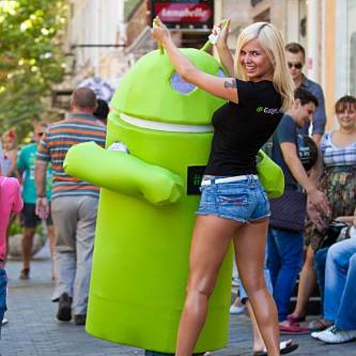 "Самый реалистичный 3D-смартфон" был представлен в виде живой модели - победительницы кастинга "Лучший маляр для #Гаджета", эффектно двигающейся в окне нового магазина.