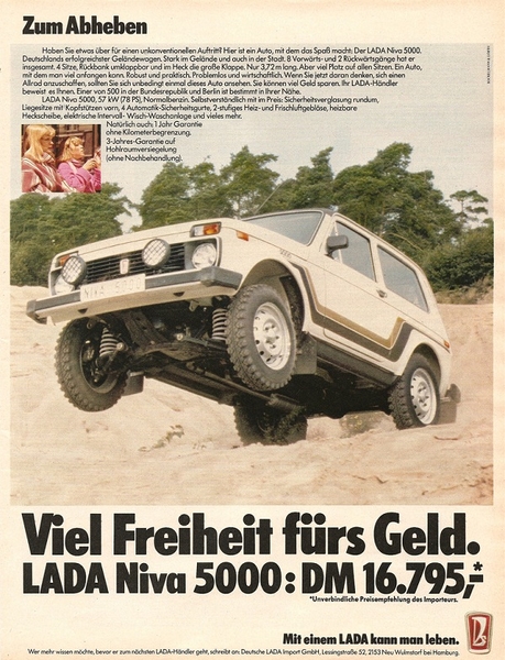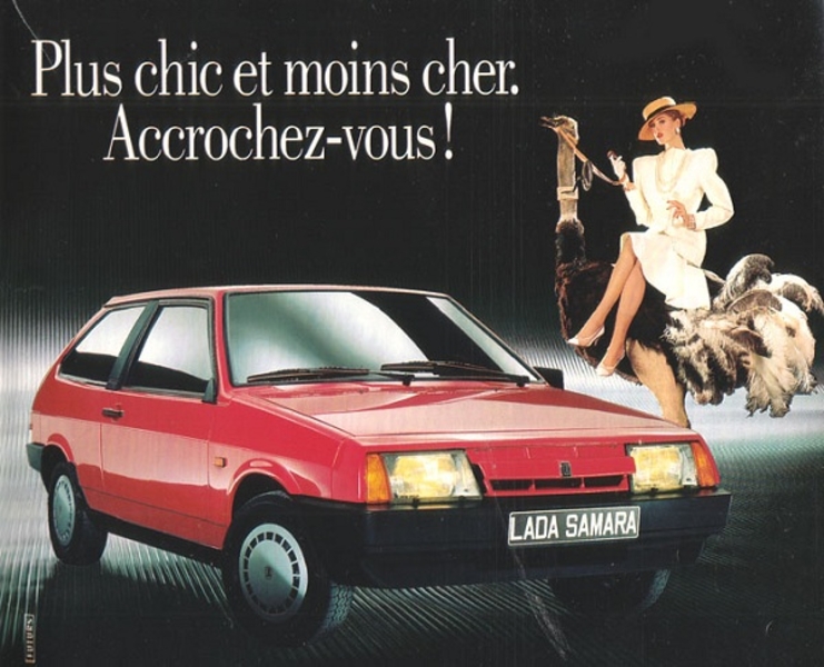 Западные водители выбирали Lada благодаря отличному соотношению цена/качество. Еще бы, ведь реклама Lada Riva (ВАЗ-2105) для Британии обещает "щетки на фарах, ремни безопасности на заднем сиденье, настраиваемые из салона боковые зеркала по цене лишь ?2895".