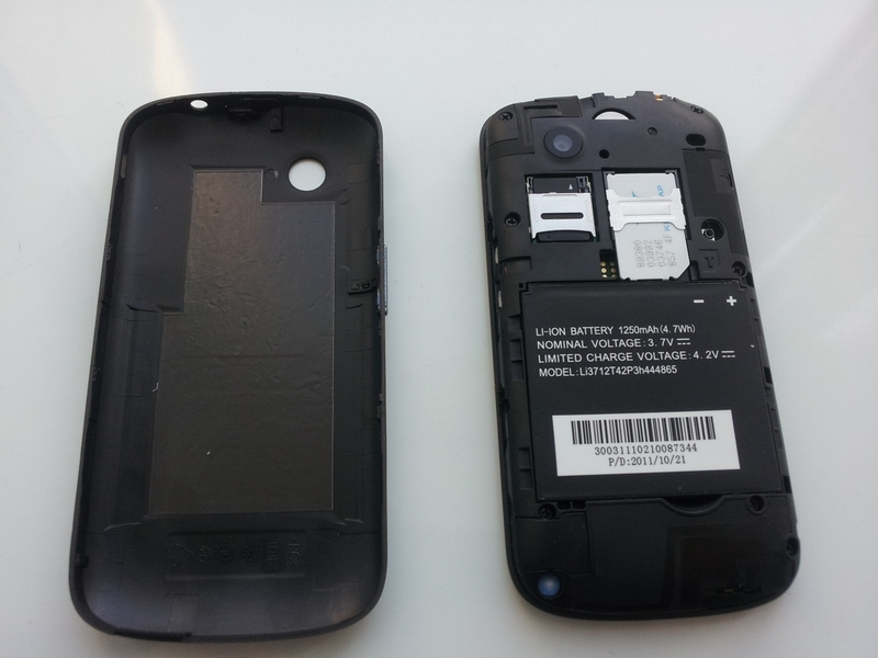 Несмотря на кажущуюся плотность корпуса, заднюю крышку можно снять очень легко. Для этого есть небольшое углубление для ногтя на нижнем торце корпуса, прямо возле разговорного динамика. За крышкой располагается аккумулятор ёмкостью 1250 мАч, которого хватает при обычной нагрузке максимум на день. Рядом расположены слоты для MicroSD и SIM-карты. Кстати, карточка MicroSD объёмом 2 Гб идет в комплекте с телефоном. Кроме того, со смартфоном поставляются ещё наушники, Micro-USB кабель и зарядка.