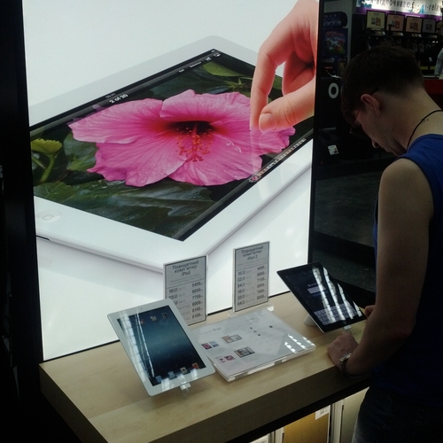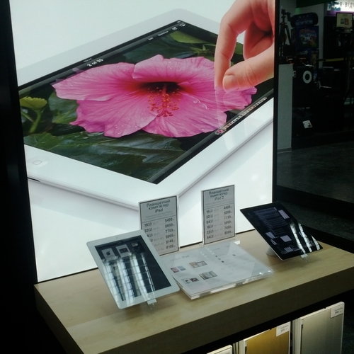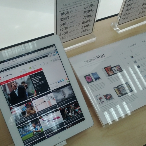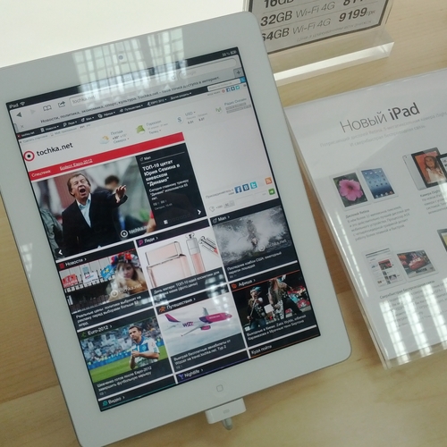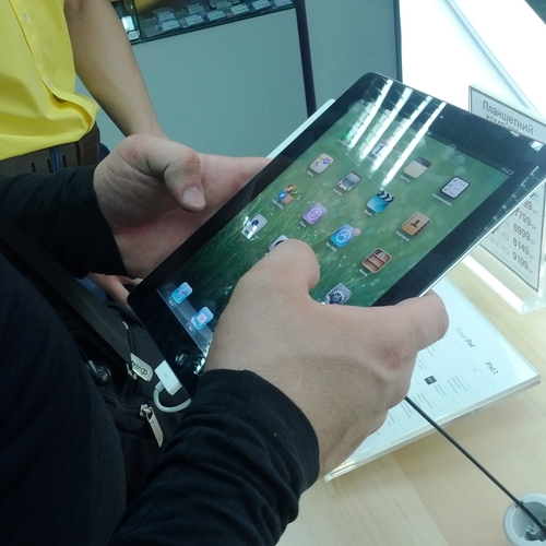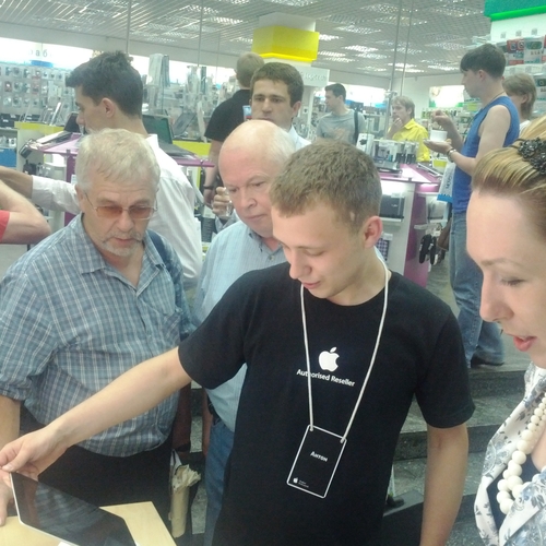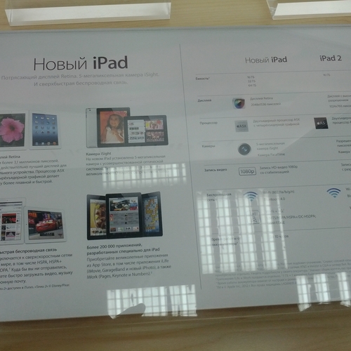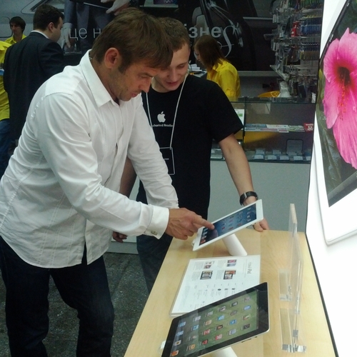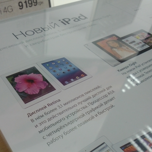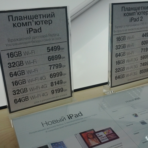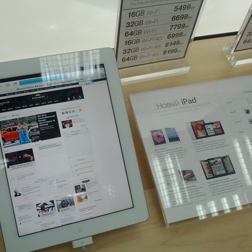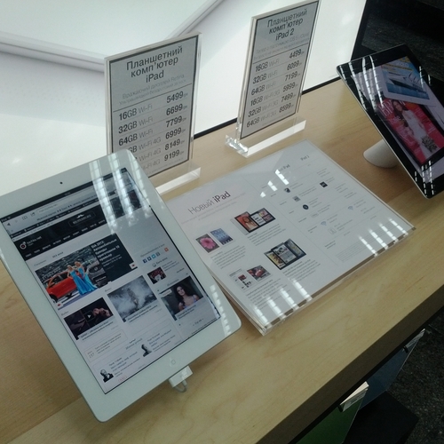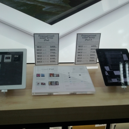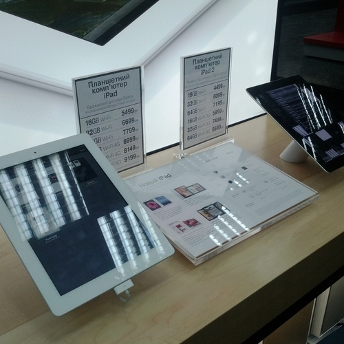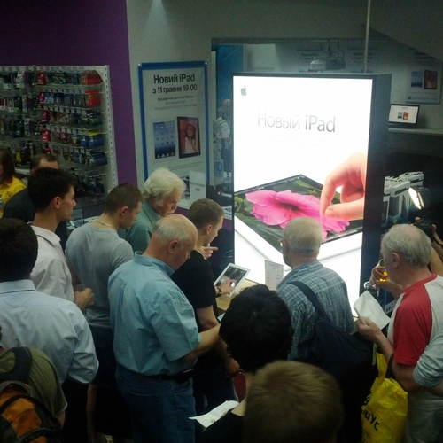 Но ажиотажа, который мы видели за рубежом, в частности в США, где огромные очереди стояли возле входа в Apple Store желая приобрести новинку одними из первых - у нас не наблюдалось вообще. Да, никаких толп и даже намеков на очереди в самом помещении магазина не было. Видимо, из-за того, что новый iPad появился во многих точках продаж одновременно, а цена на него оказалась не такая доступная каждому украинскому покупателю. Покупатели подходили, интересовались, удивлялись но покупать не спешили.